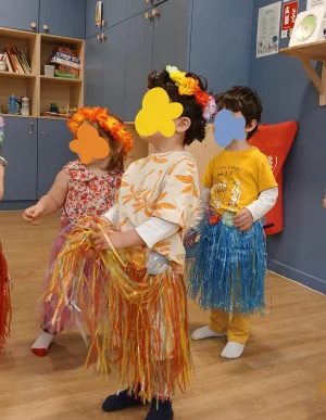 Journée Tahiti à la crèche Convention : les petits aventuriers enfilent leurs tenues de vahinés et s'initient aux couleurs et aux danses d'un ailleurs ensoleillé.