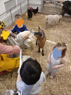 Grande découverte pour les bambins de Convention : une visite dans la crèche voisine pour approcher poules, moutons et chèvres, et toucher la ferme du bout des doigts.