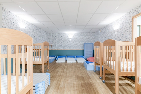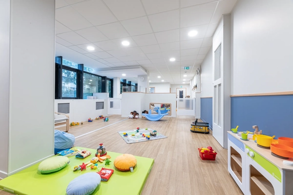 L'agencement intérieur mise sur une circulation fluide entre les zones d'activités. Un espace de jeu central regroupe structures à grimper, poupées, porteurs et un tunnel en toile parfait pour les jeux de cache-cache. Une salle de repos séparée garantit des siestes réparatrices, loin des stimulations de la journée.