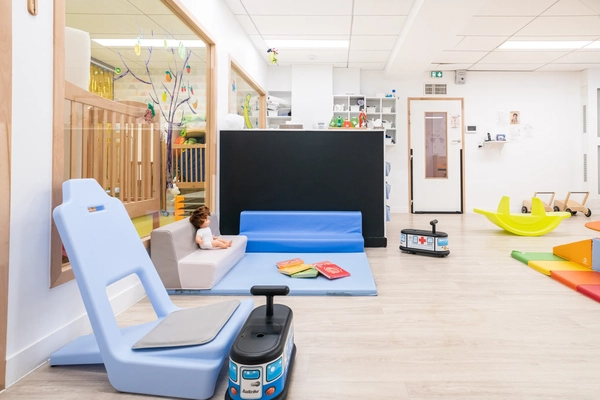 Sur 153 m² intérieurs, la crèche est aménagée avec des porteurs pour enfants, qui favorisent la marche et les premières explorations de l'espace, et des tapis colorés qui délimitent les zones de jeux libres et d'activités. Les espaces sont conçus pour alterner stimulation et repos, avec des coins sieste bien protégés et des zones d'activités créatives.